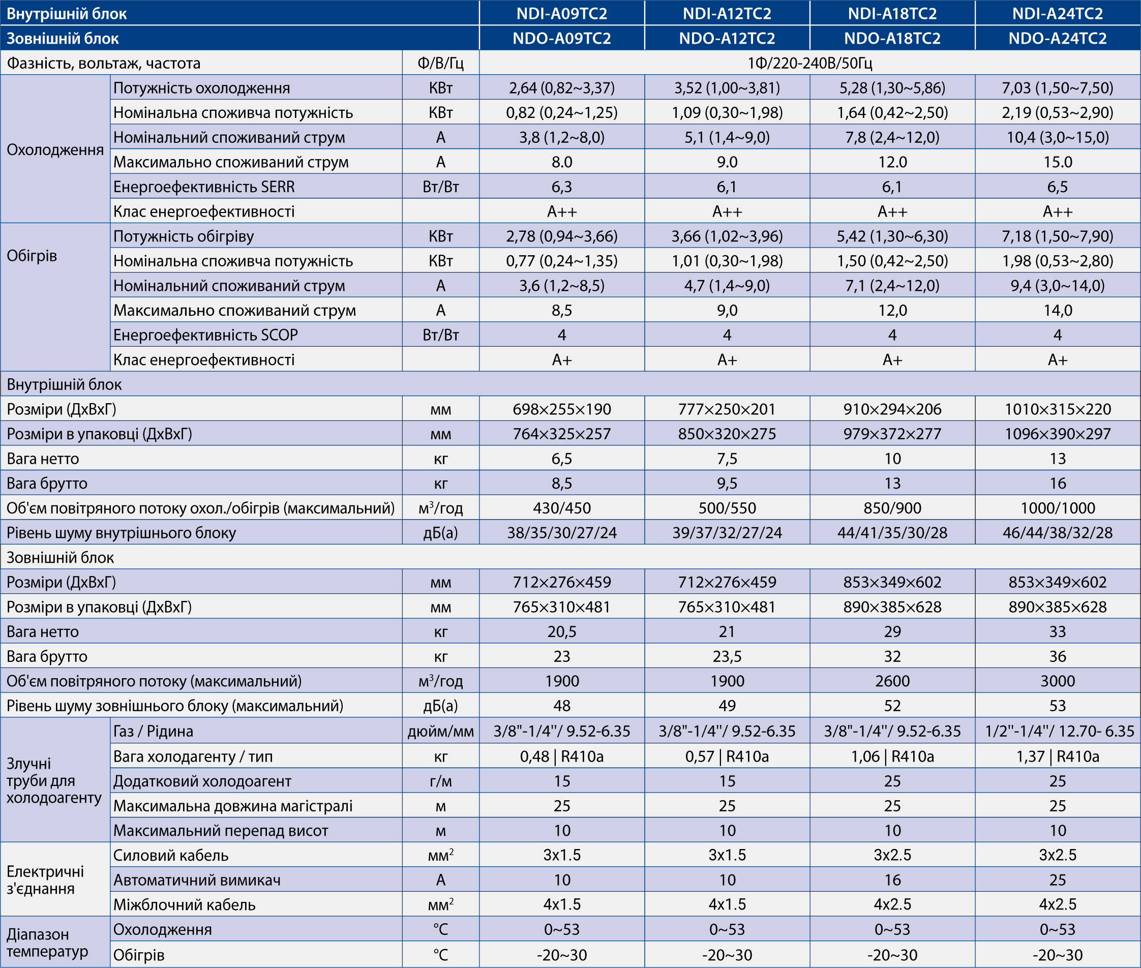- Потужність охолодження, кВт: 2,6 (0,94-3,35) кВт
