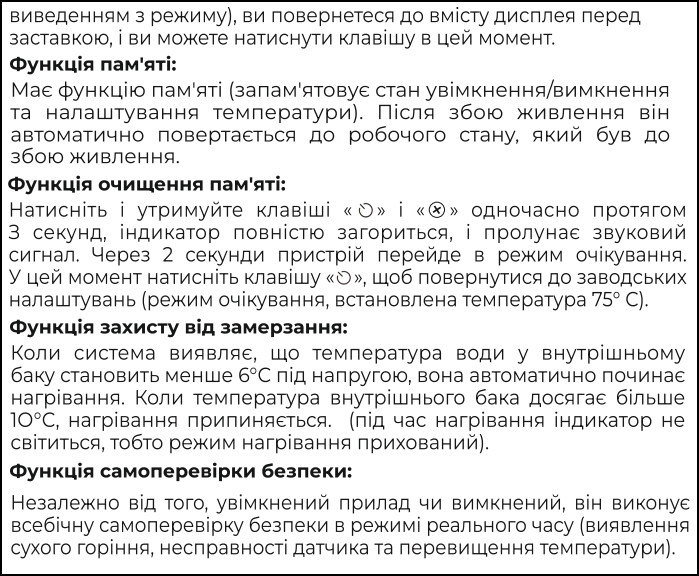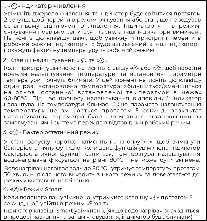 Режим Бактеріостатичний– водонагрівач нагріває воду до 80°C і утримує цю температуру приблизно 30 хвилин. Такий термічний цикл зменшує кількість бактерій у баку та трубках, а також запобігає їх розмноженню.